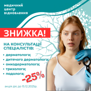 Тільки зараз у Медичному центрі Відновлення діє знижка 25% НА КОНСУЛЬТАЦІЇ ФАХІВЦІВ , ЯКІ МОЖУТЬ ВРЯТУВАТИ ВАШЕ ЗДОРОВʼЯ ШКІРИ!